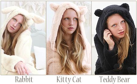 たれ耳のうさぎ、ピッととんがり耳のねこ、コロンとした耳のくまのキュートなフードデザインから好みのタイプをセレクトできます。