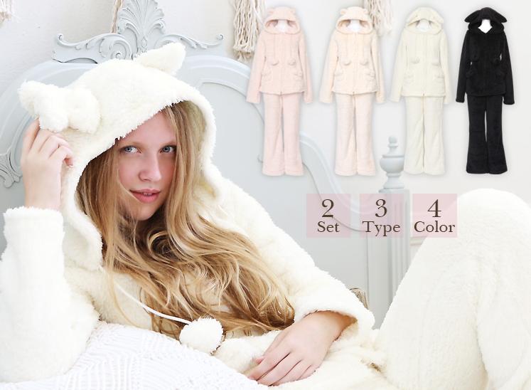 アニマル耳つきルームウェアもこもこパジャマ部屋着パーカー上下セット