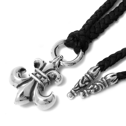 上質な革を編みこんだコードは好みの長さで調整も可能、先端にはボロチップのパーツを配した粋なネックレスです。